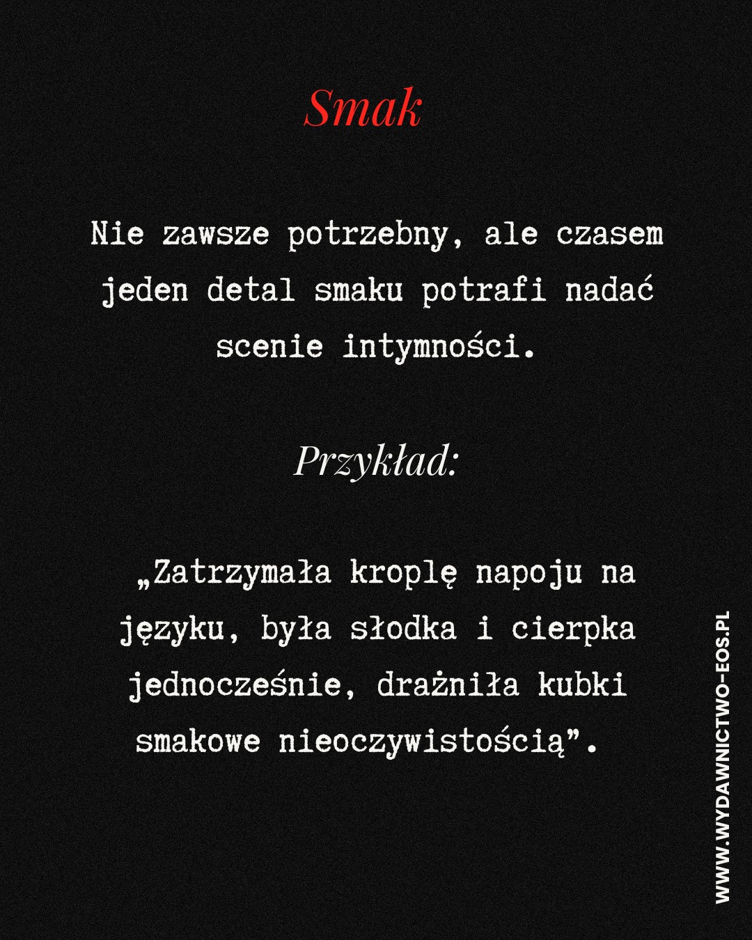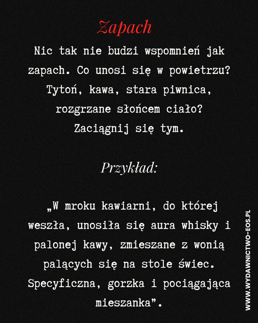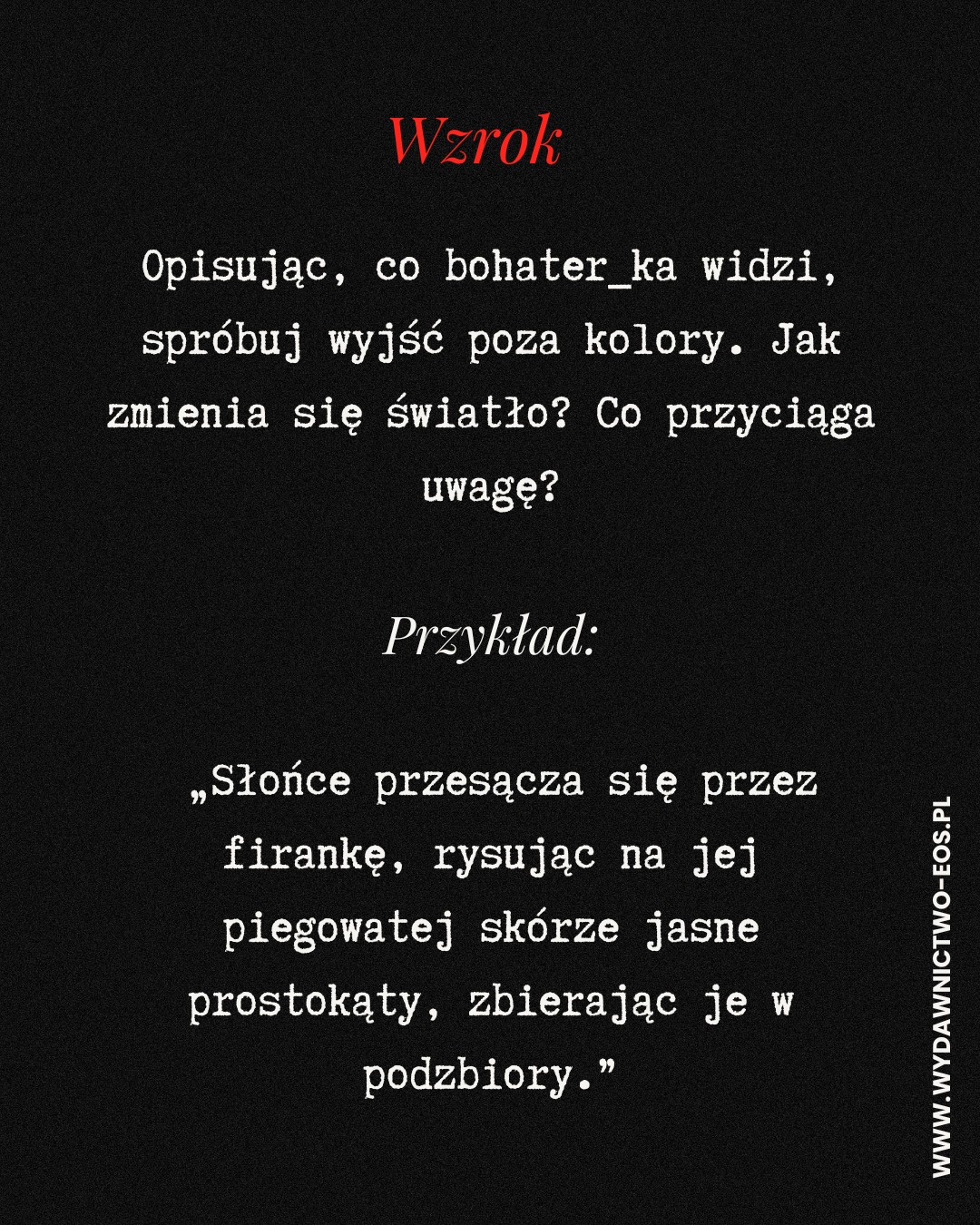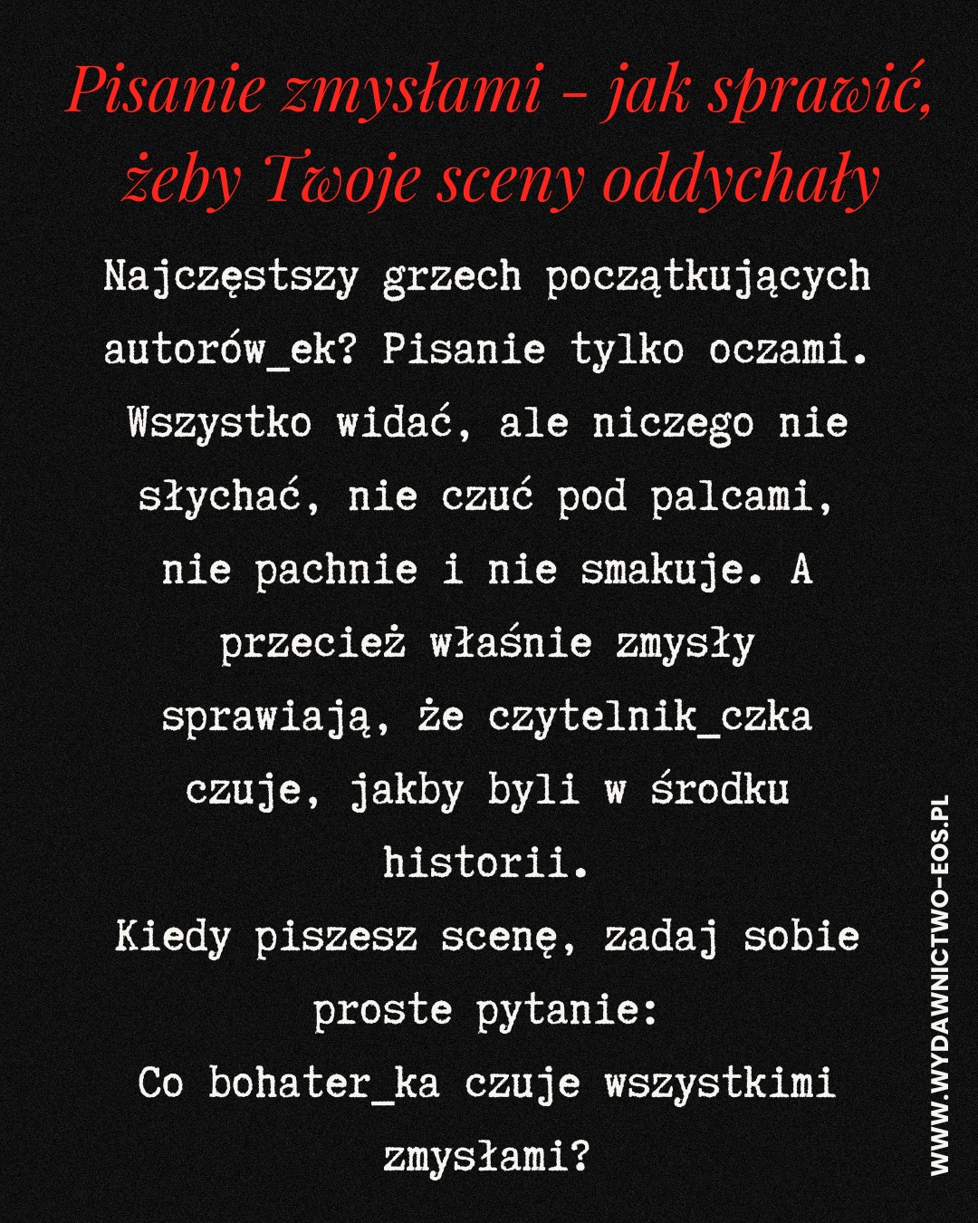 Najczęstszy grzech początkujących autorów? Pisanie tylko oczami. Wszystko widać, ale niczego nie słychać, nie czuć pod palcami, nie pachnie i nie smakuje. A przecież właśnie zmysły sprawiają, że czytelnik_czka czuje, jakby był_a w środku historii.