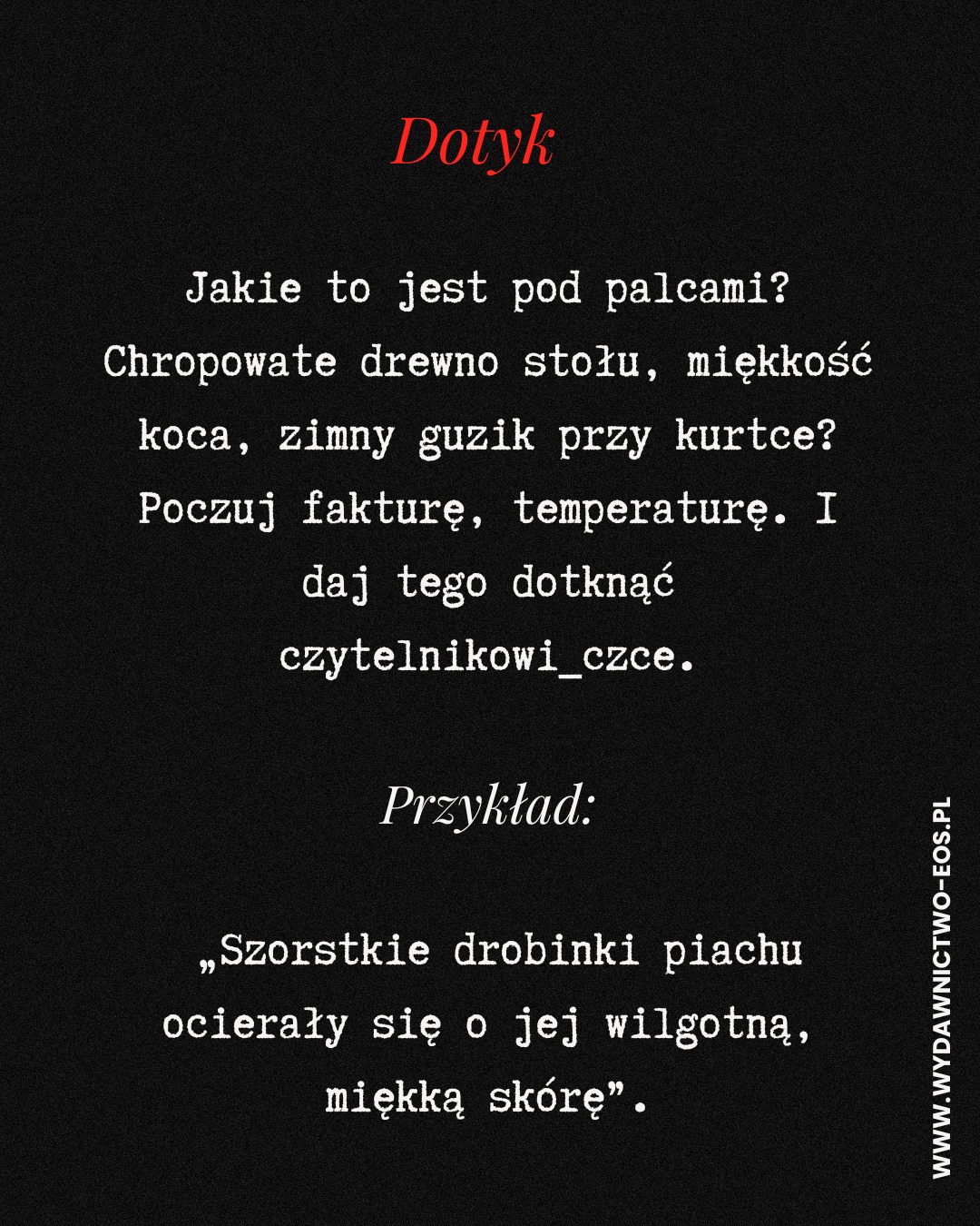 Jakie to jest pod palcami? Chropowate drewno stołu, miękkość koca, zimny guzik przy kurtce? Poczuj fakturę, temperaturę. I daj dotknąć tego czytelnikowi_czce.