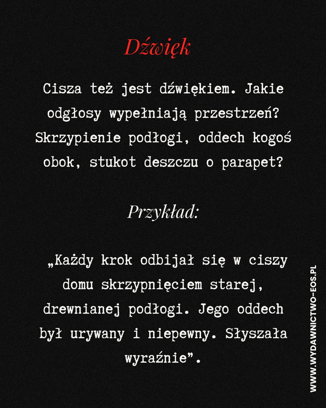 Cisza też jest dźwiękiem. Jakie odgłosy wypełniają przestrzeń? Skrzypienie podłogi, oddech kogoś obok, stukot deszczu o parapet?